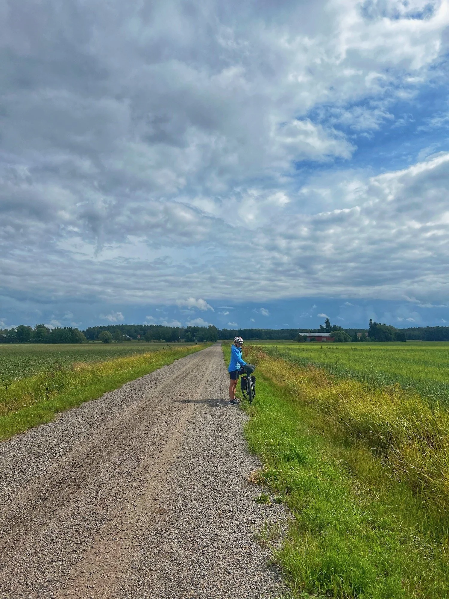 Aamupalan jälkeen jatkoimme hiekkatietä (Norrstrandsvägen) joka lähti suoraan Gammelgårdin edestä, emme halunneet mennä vilkkaalle kapealle asfalttitielle ja saimmekin ihan omassa rauhassa polkea kohti Korppoota hienoissa maalaimaisemissa. Iso peukku tälle reitille, joka näyttäisi olevan ainoa vaihtoehto “päätien” lisäksi.