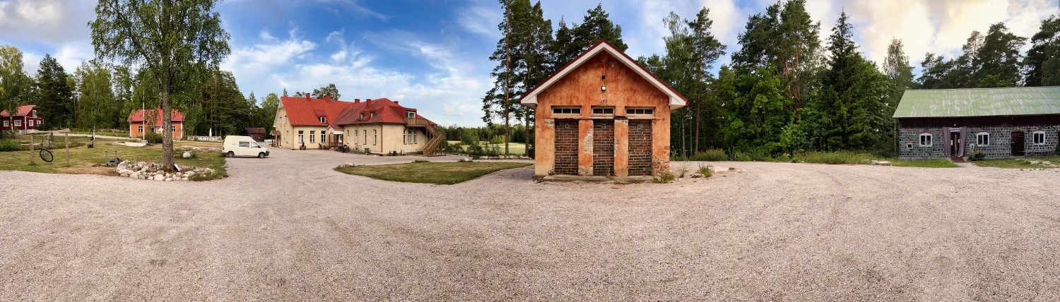 Jatulintarhan näkemisen jälkeen polkaisimme pienen matkan ja toivoimme pääsevämme telttailemaan mitä erikoisemmalta yhtälöltä kuulostavaan paikkaan kuin pizzaa ja padelia. Alku vaikutti lupaavalta, viehkeä kartanomainen tunnelma rauhaisalla paikalla. Ja löytyi sieltä lasiseinällinen padelkenttä pihaltakin, mielenkiintoista! Ja myös pizzeria punatiilisessä rakennuksessa! Tästä oli jo paljon parempi fiilis kuin ajatuksesta Nauvon sataman hälinässä telttailusta.